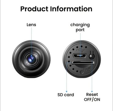Hərəkət aşkarlaması, audio yazma və uzaqdan monitorinq funksiyaları ilə təchiz edilmiş silindrik formalı mini təhlükəsizlik kamerası. Kompakt qara rəngli korpusa malikdir. Objektivin yerləşdiyi ön hissə dairəvidir. Kamera işləmək üçün elektriklə təchiz olunmalıdır. Yükləmə portu, SD kart yuvası və Sıfırlama/Açma-Qapama düyməsi mövcuddur. Ölçüləri 2.2 x 2.2 x 3.9 sm-dir. Ev, ofis və ya anbarı qorumaq üçün etibarlı seçimdir.