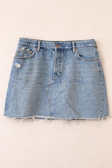 Denim ətək - Material: klassik mavi denim (pambıq qarışımı) - Stil: qısa/mini, düz kəsim - Dizayn xüsusiyyətləri: - Ön hissədə üçbucaq kəsim tikişi - Dib hissədə xam, tüklənmiş kənar - Yüngü...