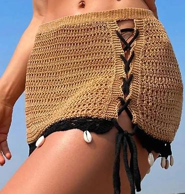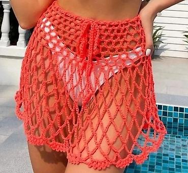 Bu, çimərlik geyimi kimi nəzərdə tutulmuş, əl işi olan makrame toxunuşlu yubkadır. Ağ rəngdədir və uzunluğu dizdən aşağıdır, yanlarında isə açıq kəsim və uzun saçaqlar mövcuddur. Toxunma naxışı həm estetik, həm də rahatdır. Çimərlikdə və ya hovuz kənarında istifadə üçün əlverişlidir. Həmçinin, yay tətilləri və gəzintiləri üçün də uyğundur.