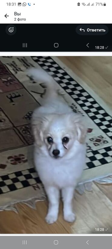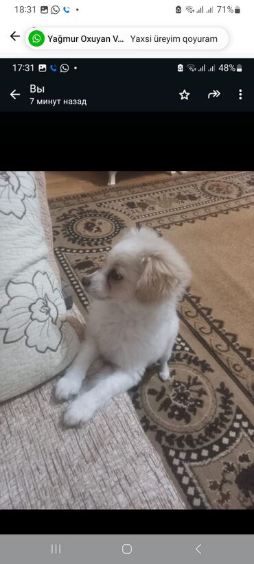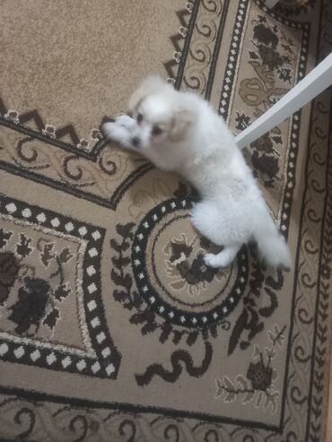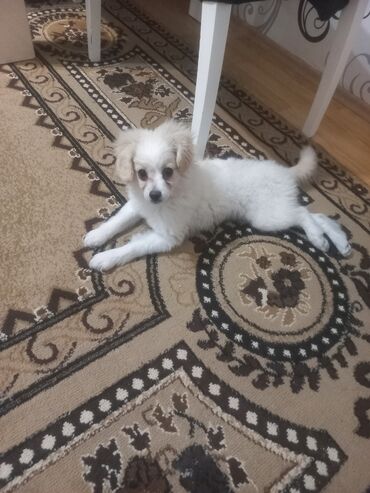 2 ayMiniatür it balası – ağ rəngdə, krem tonlu qulaqları olan uzun tüklü, qısa burunlu və yumru gözlü. Zərif bədən quruluşu, tüklü quyruq, yumşaq və sıx örtüyə malikdir. Ev şəraitinə uyğun, sakit və mehriban görünüşlü, qucağı sevən tipdir. Kiçik ölçüsü sayəsində mənzil üçün idealdır, az yer tutur. Ayıq və oynaqdır, uşaqlarla və ailə ilə vaxt keçirməyə meyllidir. Gündəlik qısa gəzinti və fırçalama ilə rahat saxlanır. Ağ rəng tüklərində təmizlik görüntüsü üstünlük verir; göz ətrafında yüngül krem izləri var, fotolarda görünür. Yeməkdə seçici deyil, quru yem və yüngül püre rasionuna uyğunlaşa bilər. Təməl komandaları öyrənməyə həvəsli, oyuncaqlarla oynamağı sevir. Ev heyvanı axtaranlar üçün balaca, mehriban yoldaş.