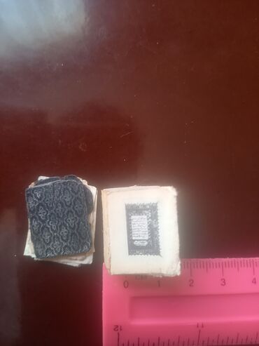 Miniatür Qurani Kərimkitabı - Format: cib ölçülü, çox kiçik (təxminən 2x1 sm; ölçü üçün şəkldə xətkeş göstərilib) - Qapaq: bənövşəyi-qırmızı tonlarda bəzəkli ornamentli cild - Kənarlar: qızılı iş...