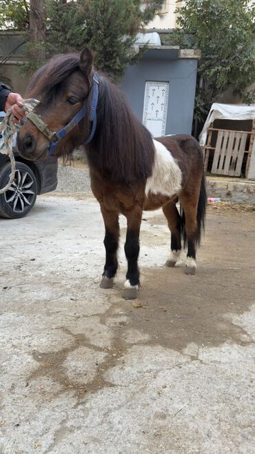 PoniMiniatür poni – rəngli (qara-ağ və qəhvəyi-ağ), qalın yal və quyruqlu. Şəkillərdə iki poni görünür: biri daha tünd qəhvəyi-çəhrayı tonlarda, digəri qara-ağ ləkəli. Boyları alçaq, kompakt bədən quruluşu, güclü dırnaqlar. Uşaqlar üçün gəzinti və fotoşəkil çəkilişləri, həyət/farm dekorativ saxlanma üçün uyğundur. Yüyən və cilovla idarə olunur, insanla ünsiyyətə tez öyrəşir. Həyət şəraitinə, otlaq və qışda quru yem rasionuna uyğun. Yüngül qoşqu və yəhər üçün münasib ölçü. Ailəvi istirahət məkanları, kənd turizmi, mini-ferma və zoopark layihələri üçün ideal seçim.