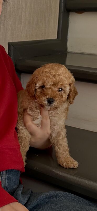 Miniatür pudel balası - Cins: Toy/Mini Poodle (şirin qıvrım tüklü, krem/qızılı rəng) - Ölçü: kiçik, mənzil üçün uyğun - Xasiyyət: mehriban, ağıllı, uşaqlarla və digər ev heyvanları ilə rahat uyğun...