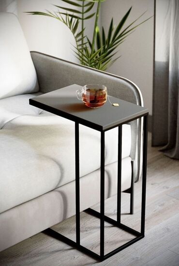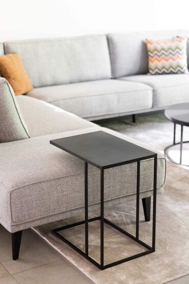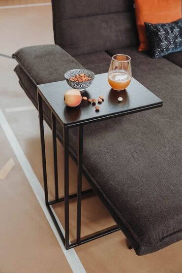 - Dizayn: nazik metal karkas və düzbucaqlı səth; C formalı baza sayəsində divanın altına rahat sürüşür, oturarkən laptop, içki, qəlyanaltı və kitabı əl altında saxlayır.