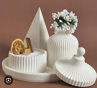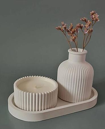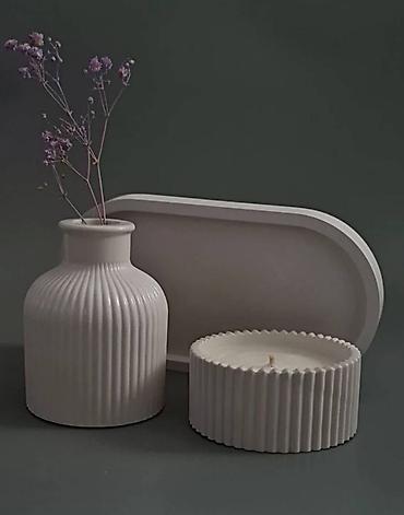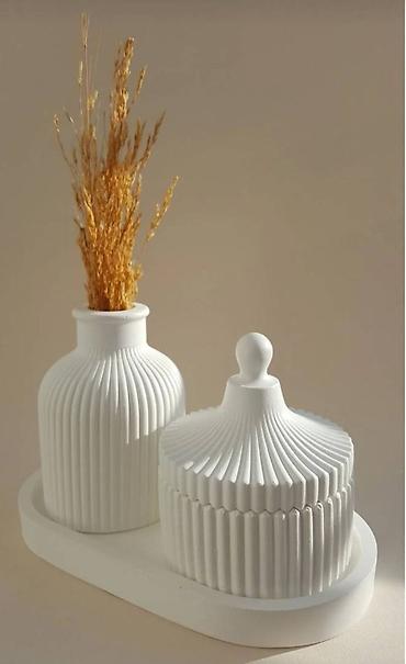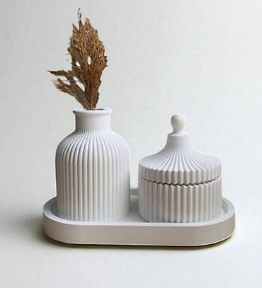 Minimalist dekor dəsti - 3 hissədən ibarət: relyefli naxışlı silindrik vaza, qapaqlı kiçik qab və uyğun tray (oval formalı). - Vaza incə qurudulmuş güllər, qələmlər və ya fırçalar üçün uyğundur. -...