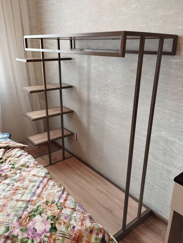 Metall çərçivəli loft üslubunda rəf sistemi - Dizayn: Asimmetrik, pilləli kompozisiya; açıq karkas konstruksiya. Otağa yüngül və müasir görünüş qatır. - Material: Qara metal karkas + açıq rəngli t...