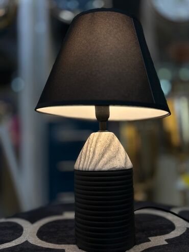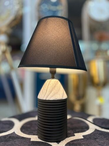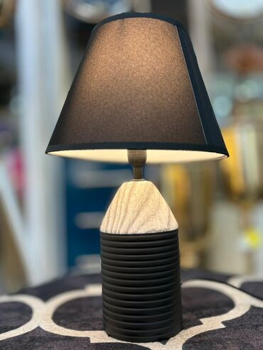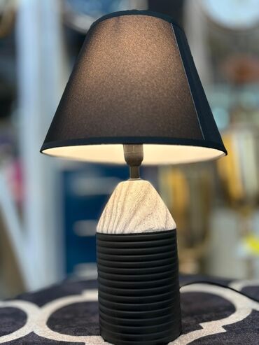 Masaüstü abajur – minimalist və skandi üslubunda - Korpus: aşağı hissəsi qara, halqavari relyefli silindrik baza; üst hissə ağac teksturalı konus formasında. - Kölgə (plafon): mat qara parça, klas...