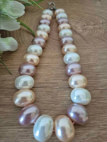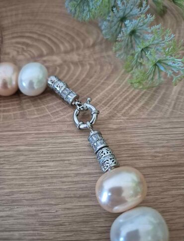 - Təbii şirin su mirvarilərindən hazırlanmış qolbaq boyunbağı seti. Boyunbağı iri, oval formalı mirvarilərin ardıcıl düzülüşündən ibarətdir; rəng palette-si krem, şampan və açıq lavanda/çəhrayı tonlarında parıltılı keçidlər yaradır.