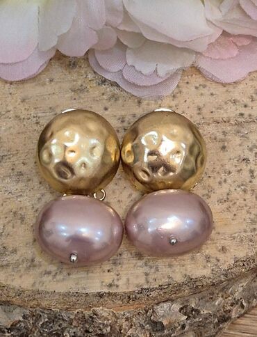 - Uyğun sırğalar: yuxarı hissəsi çəkic naxışlı qızılı tonlu metal, aşağı hissədə açıq bənövşəyi-çəhrayı iri oval mirvarilər.