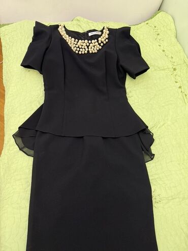 Mirvari bəzəkli qara qadın donu incə detalları və klassik görünüşü ilə seçilir. Yuvarlaq yaxalıq hissəsi müxtəlif ölçülü mirvarilərlə zəngin bəzədilib, bu da geyimə zərif və dəbdəbəli bir hava qatır. Qısa qollu və peplum tipli ətək dizaynı ilə don bədənə qəşəng oturur. Bu don xüsusi tədbirlər, ziyafətlər və iş görüşləri üçün uyğundur, sahibinə qəşəng və cəlbedici görünüş bəxş edir. Arxadan fermuarla bağlanır, bu da geyimi rahat edir. Klassik qara rəngi sayəsində müxtəlif aksesuarlarla asanlıqla kombinasiya edilə bilər.