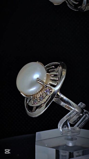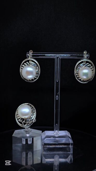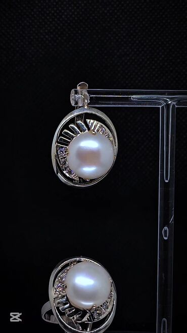 Zərgərlik dəsti – mirvari və parlaq qaşlarla - Tərkib: iri ağ mirvari mərkəzli sırğalar və ona uyğun üzük - Dizayn: dairəvi formaya malik klassik dizayn; mirvarinin ətrafı parlaq, şəffaf qaşlarla ...