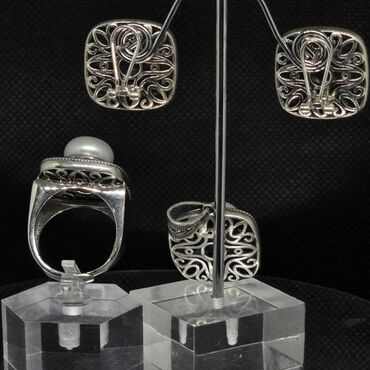 Bu dəstə tebii okean Yapon mirvari inci üzük və sırğalar daxildir. Üzük mürəkkəb çiçək naxışlı dizayna malikdir və mərkəzində inci yerləşdirilib. Sırğalar hər biri inci ilə bəzədilmiş, örgülü ha...