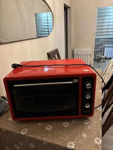 - Elektrik mini-soba: Parlaq qırmızı korpus, ön şüşə qapı və iri metal tutacaq. Sağ paneldə 3 mexaniki tənzimləyici (temperatur, rejim, taymer). Elektrik şnur ilə. Bişirmə, qızartma və qril üçün çoxfunksiyalı.