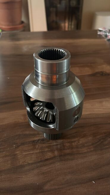 Qara rəngdə olan avtomobil diferensialı. Bu diferensial, gücü təkərlərə ötürmək üçün nəzərdə tutulmuşdur. Mexanizmin daxili quruluşu yaxşı vəziyyətdə görünür. Avtomobilinizin ötürücü sistemini təmi...