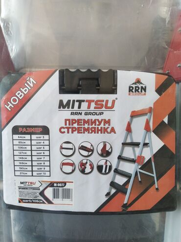 Məişət və peşəkar işlər üçün uyğun, etiketdə göstərilən funksional ikonalarla: möhkəm bərkidilmə, qatlama düyməsi, geniş üst platforma və sərt dayaq. Marka: MITTSU (RRN Group). Barcode etiket üzərindədir.