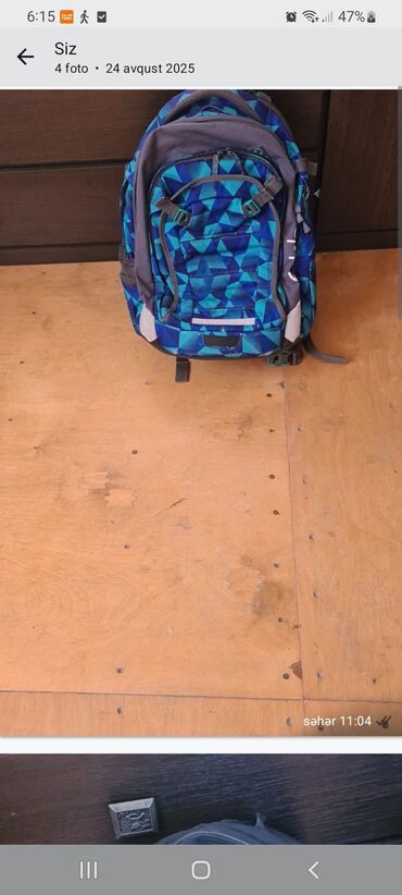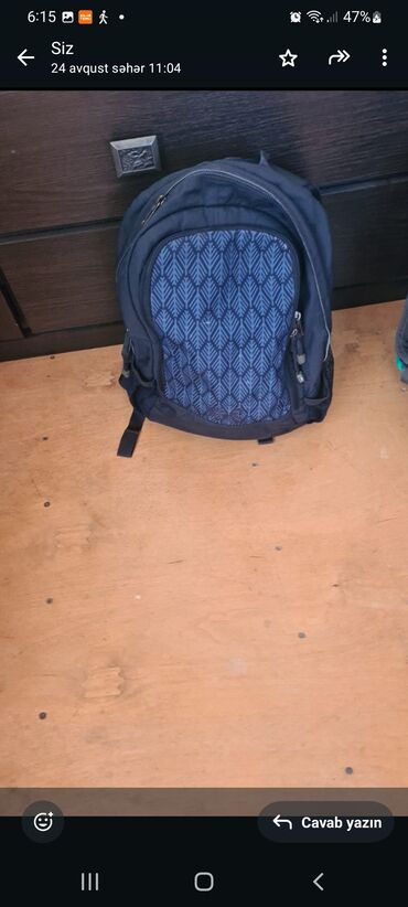 Məktəb çantası yeni alınıb - Tünd göy fon üzərində çoxrəngli abstrakt naxış - Ön tərəfdə böyük fermuarlı bölmə - Əsas geniş bölmə: ikili fermuarla açılıb-bağlanır - Yanlarda iki ədəd elastik tor c...