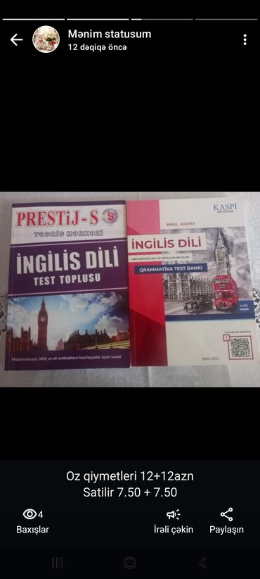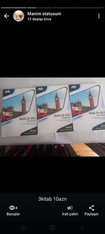 Kitabların mövzuları: məntiq, riyaziyyat, fizika, ingilis dili (nazariyyə və test bankları). Orta məktəb (2, 5, 7-ci sinif), abituriyent, magistratura, MİQ və liseyə qəbul hazırlığı üçün uyğundur. Endirimle satiram oz qiymetleri 6, 10, 11 ,12 azndi. 40 50 60 65faiz endirimlerle satiram