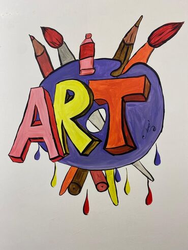 - İncəsənət mövzusu: “ART” yazısı, fırça, karandaş, boya tüpləri və rəng damcıları