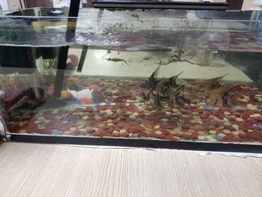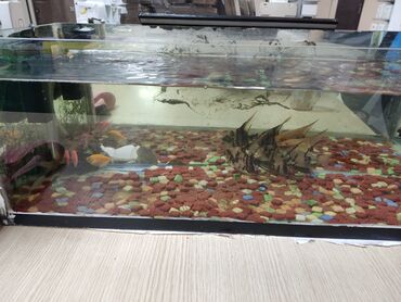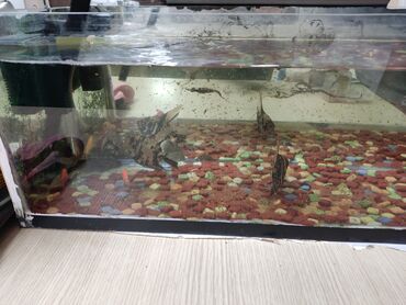 - Şəkillərdəki akvarium və içindəki balıqlar nümayiş olunur; filtr və altlıq daşları kimi aksesuarlar görünür.