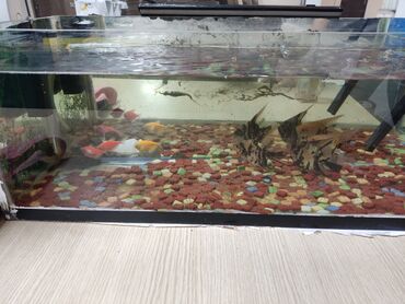 - Akvarium aksesuarları görünür: daxili filtr, hava verici, dekorativ qarışıq rəngli altlıq daşları