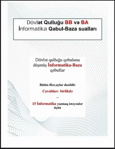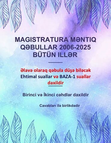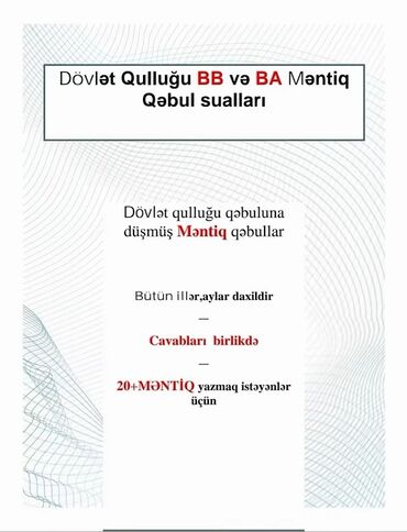 Vergi orqanlarına, Dövlət Qulluğu (BB və BA) və Magistratura imtahanlarına hazırlaşanlar üçün nəzərdə tutulmuş müxtəlif qəbul sualları topluları təqdim olunur. Bu toplulara Vergi orqanlarına düşmüş 50-dən çox məntiq sualları, Dövlət Qulluğu üçün informatika baza sualları (bütün illər və aylar daxil olmaqla, cavabları ilə birlikdə), Dövlət Qulluğu üçün 20-dən çox məntiq sualları (bütün illər və aylar daxil olmaqla, cavabları ilə birlikdə) və Magistratura məntiq qəbulları (2006-2025-ci illər, bütün illər, ehtimal suallar və BAZA-1 sualları daxil olmaqla, birinci və ikinci cəhdlər, cavabları ilə birlikdə) daxildir. Hər bir toplusu imtahana effektiv hazırlaşmaq üçün əhatəli material təqdim edir.