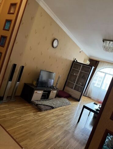 - Geniş, işıqlı zal: parket döşəmə, iri pəncərə, dekorativ çilçıraq, divar saatı, TV stendi və vitrin dolabı üçün yer. Split-kondisioner görünür.