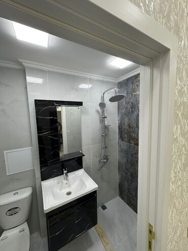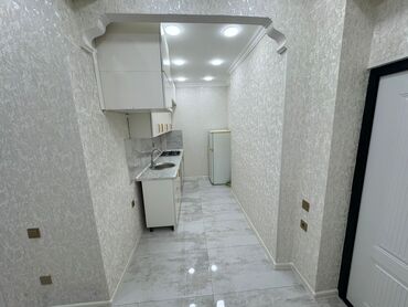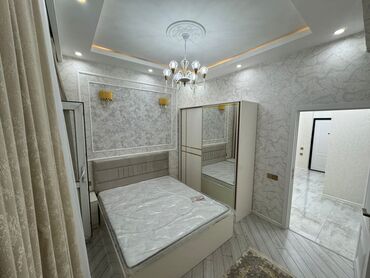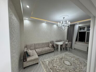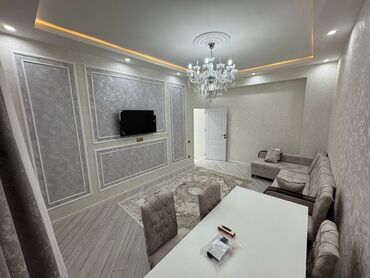 Geniş və işıqlı mənzil interyeri - Böyük zal: dekorativ bəzəkli tavan karnizləri, iki ədəd şamdan tipli çilçıraq, geniş yemək zonası (dördstul və masa), divar boyu tropik temalı panorama paneli, k...