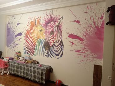 - Zal/divar dekoru: Böyük ölçülü rəngli divar rəsmi (zebra motivli) ilə fərqli və dinamik atmosfer.