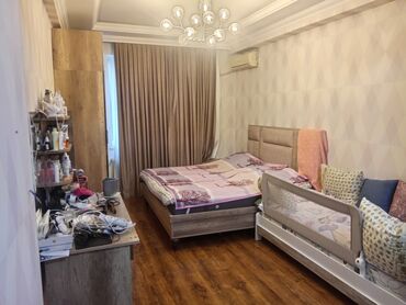 - Geniş yataq otaqları: Hər iki otaqda iri pəncərə, qalın pərdə və karnizlər, asma tavan və dekorativ işıqlandırma. Divar kağızları və müasir çilçıraqlar ilə zövqlü interyer.