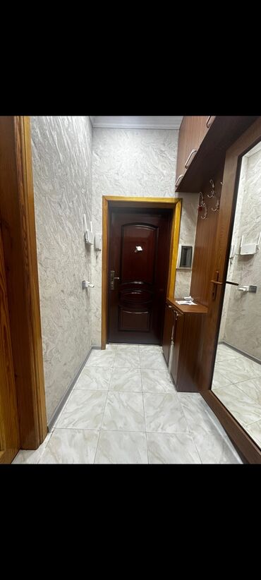 - Giriş: təhlükəsiz metal qapı, interkom, divar asqıları olan yığcam dəhliz, mərmər naxışlı kafel döşəmə.