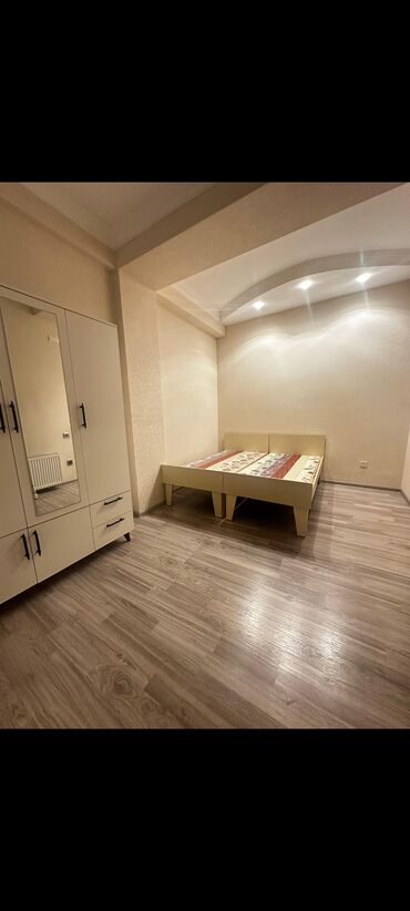 - Yataq otağı 1: geniş mərtəbəli çarpayı bazası, dəbli spot işıqlanma, laminat döşəmə, güzgülü ağ şkaf-komod.