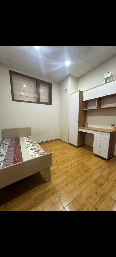 - Yataq/iş otağı 2: tək nəfərlik çarpayı, iş masası və saxlama rəfləri ilə birləşmiş şkaf, pəncərə və tül/jalyuz, tavanda LED işıqlar, taxta fakturalı kafel döşəmə.