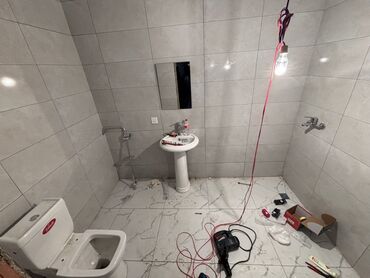 - Santexnika: sanitar qovşağın tam yığılması (unitaz, əl yuma lavabı, qarışdırıcılar), divar və döşəməyə keramik plitə/keramoqranit döşənməsi, duş/bide xəttlərinin çıxarılması, aksesuarların quraşdırılması.