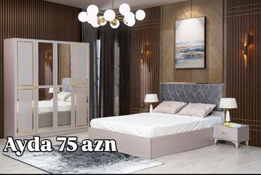 - 4 qapılı, güzgülü böyük qarderob (mərkəzdə iki böyük güzgü paneli, qızılı dekor xətləri, praktiki bölmələr).
