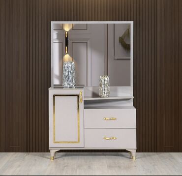 - Geniş güzgülü makiyaj masası/komod: 1 qapılı bölmə, 2 çekmece, ara rəf; qızılı dekor və tutacaqlar, metal ayaqlar.