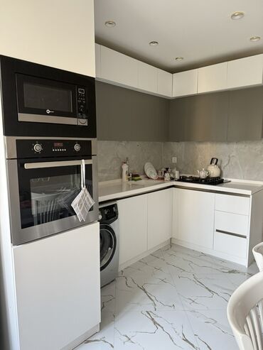 Mebel dəsti mətbəx texnikasının yerləşdirilməsi üçün hazır modullarla komplektdir; iş səthləri və saxlama zonaları zövqlə uyğunlaşdırılıb.