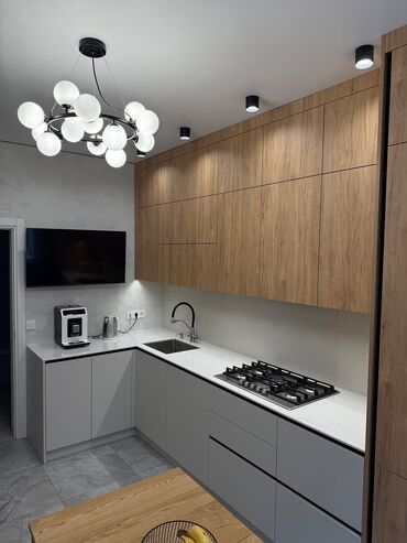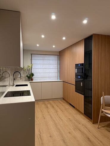 - Dizayn: Minimalist üslub, düz xətli fasadlar, inteqrə tutacaqsız sistem. İki rəng kombinasiyası – ağ/boz mat fasadlar və təbii ağac teksturalı panellər.