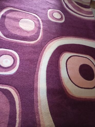 Müasir dizaynlı xalça - Ölçü: 2x3 m (şəkillərə əsasən iri ölçü) - Rənglər: bənövşəyi, qara və ağ - Naxış: dalğavari zolaqlar və müxtəlif ölçülü dairələr; interyerə dinamik, modern görünüş qatır -...