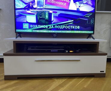 - TV stendi: üstü ağ, ara rəf aparat və aksesuarlar üçün açıq bölmə, aşağıda iri çekmece; tünd-qəhvəyi dekorativ haşiyələr.