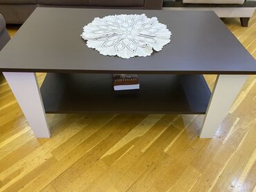- Jurnal masası: tünd qəhvəyi üst tabla, ağ ayaqlar, ortada əlavə rəf (kitab/jurnal üçün).