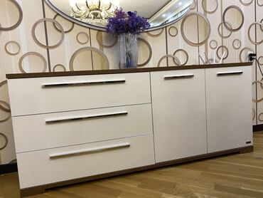 - Konsol/komod: solda 3 geniş çekmece, sağda 2 qapılı dolab; üst tabla tünd qəhvəyi, korpus krem-ağ tonlarda. Uzun metal tutacaqlar.