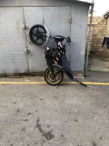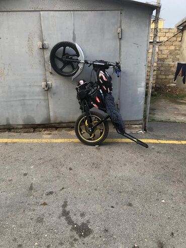 Kross tərzində modifikasiya olunmuş moped/motosiklet. - Rəng: qara kuzov, qırmızı çərçivə və disklər - Təkərlər: qalın, off‑road protektorlu şinlər - Asqı: arxa yaylı amortizatorlar, ön çəngəl qız...