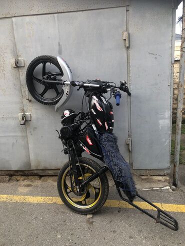 Moped/motosiklet – M50 (80cc) - Mühərrik: 50cc, karbüratorlu, 4 vitesli yarı-avtomat (ayaqla ötürmə). - Gövdə/rəng: Qara gövdə, çən və ön hissə üzərində dekorativ stikerlər. - İşıqlandırma: Ko...
