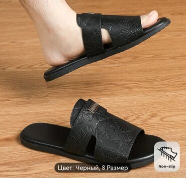 Kişi üçün qara rəngli dərili (eko-dəri) şlapan/sandalet. - Minimalist dizayn: üst hissədə iki zolaqlı konstruksiya, zolaqlarda relyefli geometrik naxış. - Rahatlıq üçün formalaşdırılmış yumşaq içl...