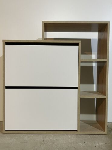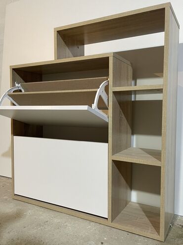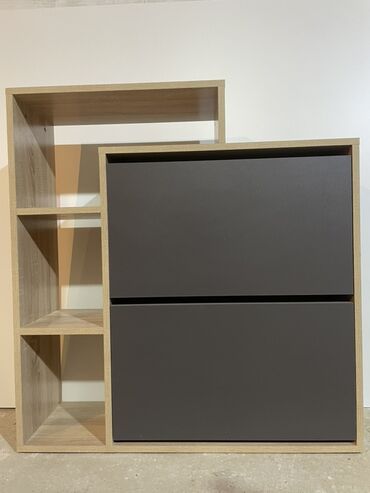 - Dizayn: Sağda 3 mərtəbəli açıq rəf bloku, solda isə 2 qatdan ibarət çevrilən (aşağıya açılan) ayaqqabı bölmələri. Üst hissədə əlavə açıq nişa.