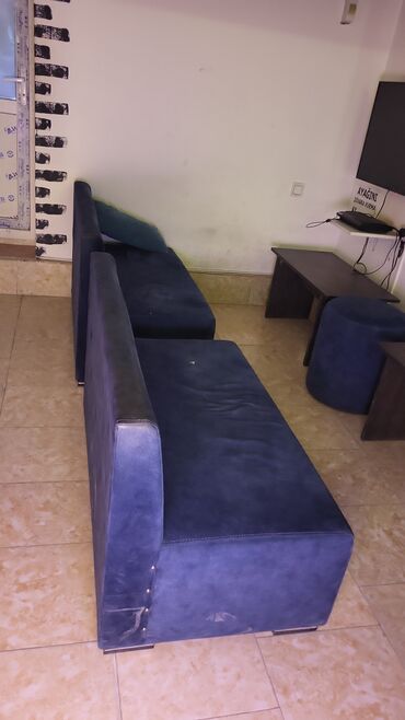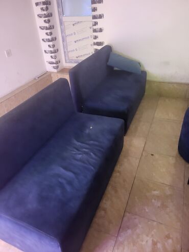 Mavi rəngdə iki hissəli divan-kreslo. Xüsusiyyətlər: - İki moduldan ibarət, birləşdirilərək geniş uzanma səthi yaradır - Yumşaq parça üzlüklü, yanlardan qapalı konturlu dizayn - Aşağı profilli otu...