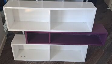 Modul divar rəfləri və şkaflar dəsti - Dizayn: ağ və bənövşəyi rəngli, parlaq səthli, müasir xəttlər. - Komplekt: müxtəlif ölçülü 2 ədəd qapalı şkaf modulu, açıq rəf blokları və üfüqi modul rəflər...