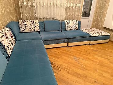 Künc divan dəsti - Forma: L-şəkilli, geniş oturacaq sahəsi ilə - Rəng: Tünd mavi korpus - Üst material: Yumşaq parça - Yastıqlar: Çıxarılan çoxsaylı iri bel yastıqları, çiçək naxışlı örtüklə - Otu...