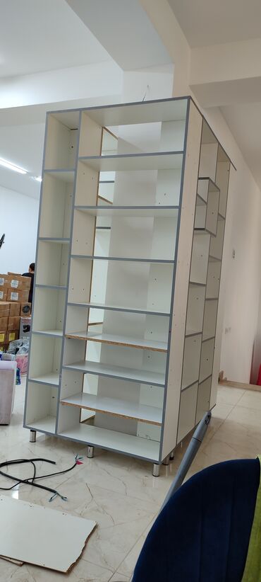 Mağaza/Anbar üçün modul rəf sistemi - Material: ağ laminat DSP (kənarları qara bantlı) - Quruluş: 2 sıradan ibarət kub formalı bölmələr; ümumilikdə çoxsaylı hücrə (malları çeşidləmək və sərgiləmək...