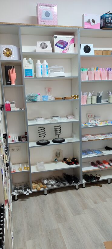 Məişət və xırdavat malları üçün tam komplekt mağaza inventarı və vitrin sistemləri. Təsvir: - Ağ rəngli, hündür modullu vitrin rəfləri – çoxsaylı bölmələr, tənzimlənən şkaf və açıq rəf kombinasiya...